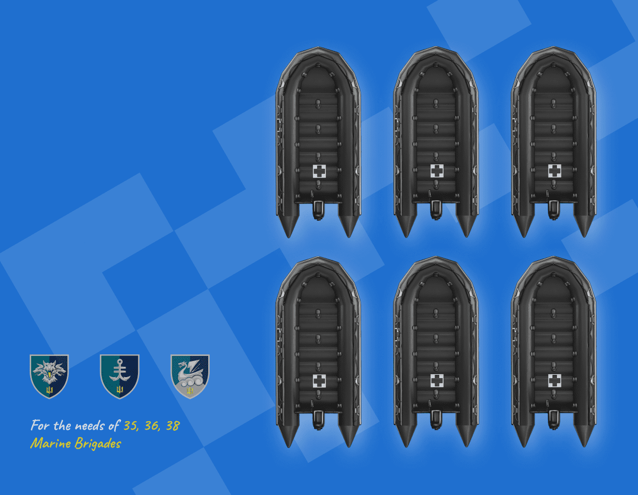 6 евакуаційних човнів та комплектуючих до них для евакуації поранених морських піхотинців 35, 36, 38 ОБрМП, які виконують бойові завдання на лівому березі Дніпра поблизу населеного пункту Кринки